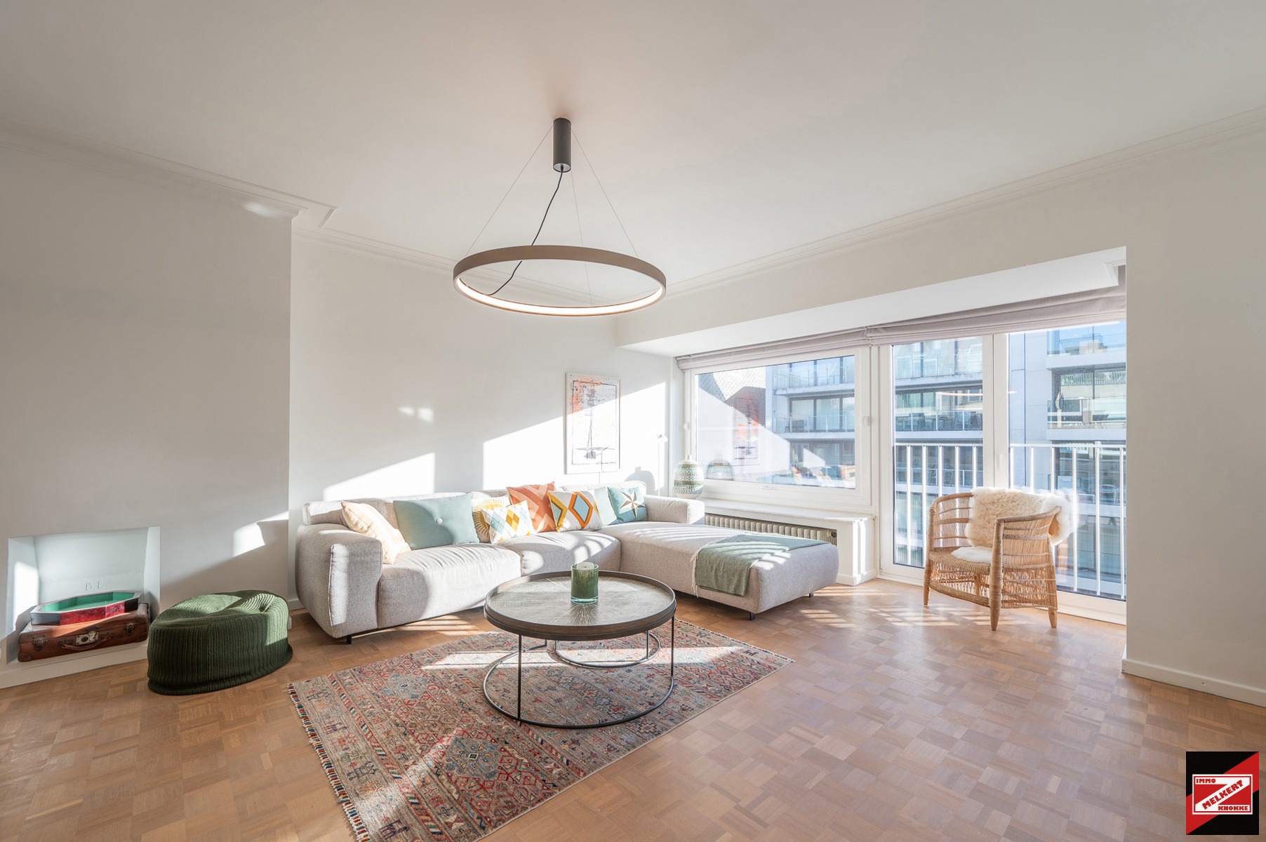 Lichtrijke en gezellige woonkamer met moderne open keuken en eetruimte, voorzien van ingemaakte kasten